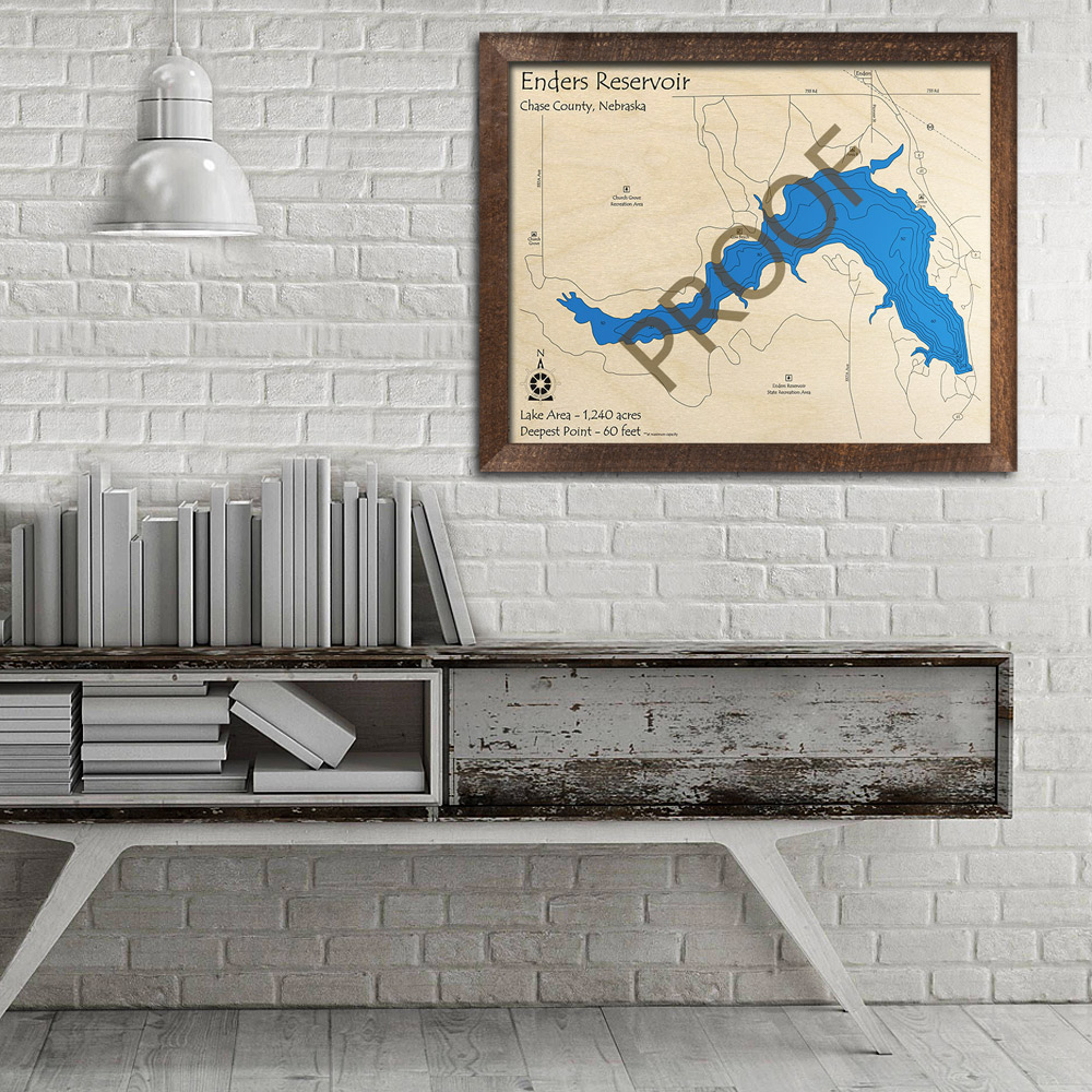 Enders Reservoir 3D Wood Map, Nebraska, Nautical Décor and