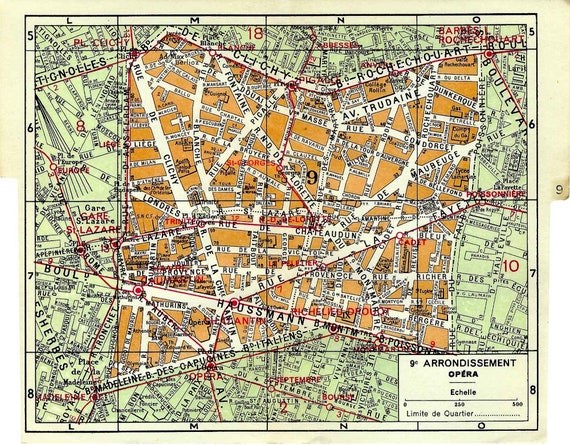 Vintage Paris 9th Arrondissement, Opera Area Map to Frame or for