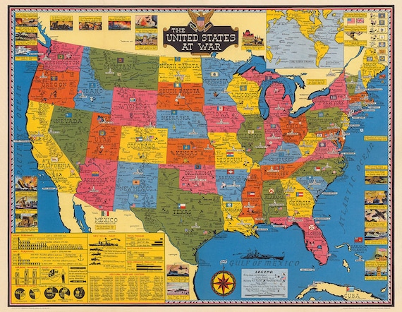 1943 USA WW2 Map United States at War US Army / Navy Map Print War